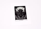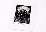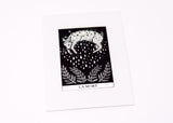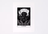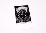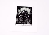 This gorgeous two color screen print is Joelle's interpretation of the Death card from the Major Arcana of the tarot deck. Equal parts playful and symbolic it’s the perfect piece of decor for those who love to consult the cards. Printed in a deliciously shimmery silver metallic ink that delights up close. A great size for adorning a small space or grouping together for a gallery wall look.