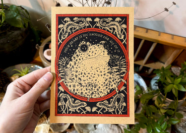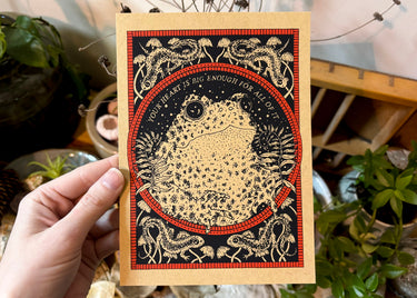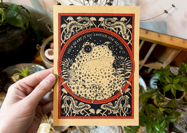 This gorgeous two color screen print features a heartfelt drawing of a toad and spotted salamanders with the words "your heart is big enough for all of it” in handwritten text. A hand printed reminder great for adorning a small space, adding to a desk, or grouping together for a gallery wall look.