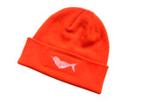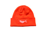 Safety First! Increase your visibility and look great at the same time, with this hi vis orange hat. It’s a cozy, stretchy beanie featuring our original natural illustration of a narwhal, hand screen printed in white water based eco ink on iconic fluorescent orange (looking for something less bright? check out our other color offerings here).