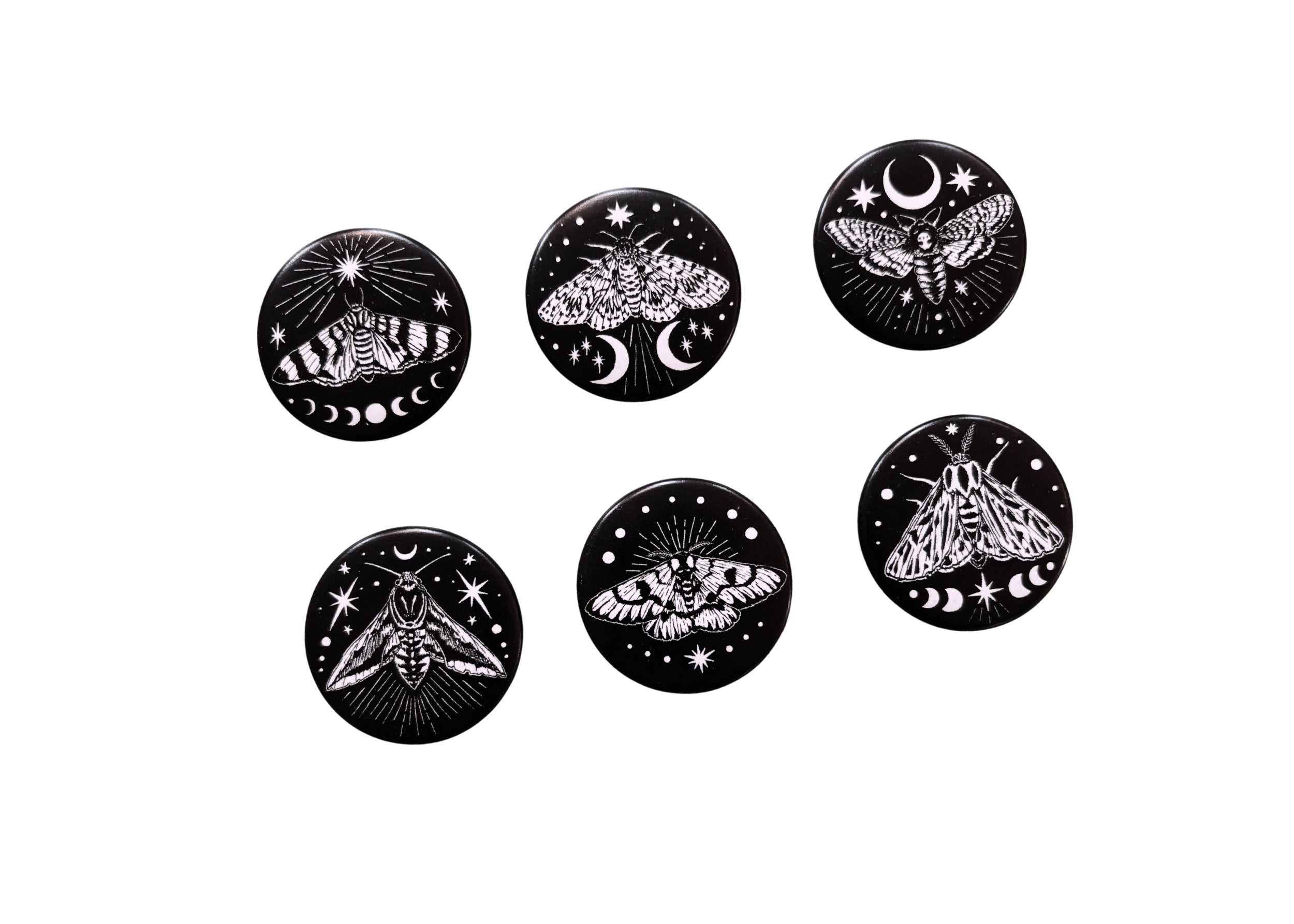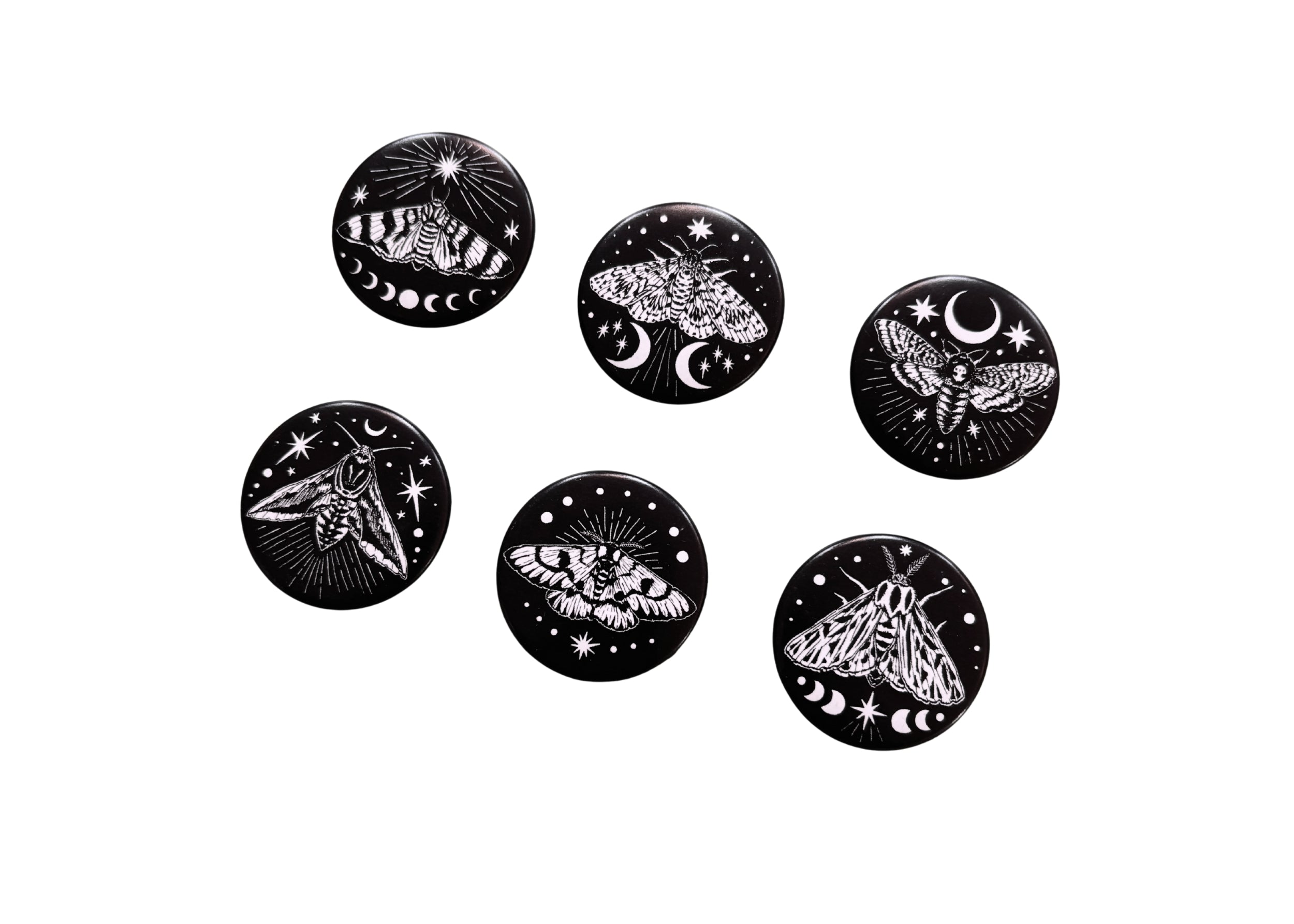 This playful moth themed button pack features our original illustrations of moths surrounded by celstial framing. A set with a touch of whimsy and a healthy dose of classic nostalgia thrown in, these are great for adding classic flair to your favorite bag or jacket.