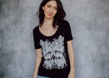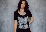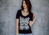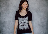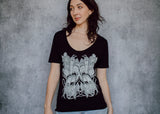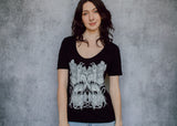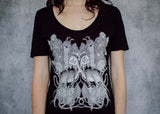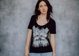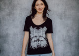 But that love of the unknown lives on in this ode to the titans of the cryptid world. All the classics are here : Bigfoot! Mothman! The Kraken! Jackalopes! My first love The Loch Ness Monster! It’s a buttery soft black scoop neck for the believer in all of us.