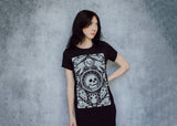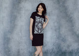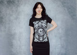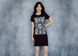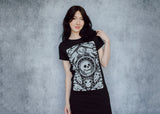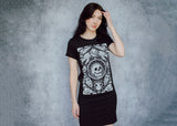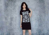 Consider this comfy and slightly oversized mini-length t-shirt dress the collector’s dream! A veritable cabinet of curiosities with meticulously textured animal skulls (and one human, we shouldn’t be left out) among hyper detailed alchemical elements.