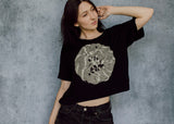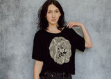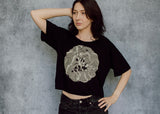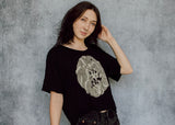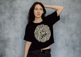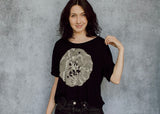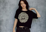 An unbelievably soft and drapey modal crop seemed like the perfect backdrop for these hyper detailed pair of river otters. The circular pattern and entangled fronds of kelp give the impression that they are tumbling over one another in a current, interlocked in their own small world.