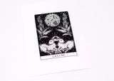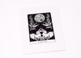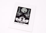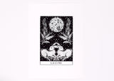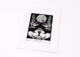 This gorgeous two color screen print is Joelle's interpretation of The Moon card from the Major Arcana of the tarot deck. Equal parts playful and symbolic it’s the perfect piece of decor for those who love to consult the cards. Printed in a deliciously shimmery silver metallic ink that delights up close. A great size for adorning a small space or grouping together for a gallery wall look.
