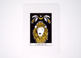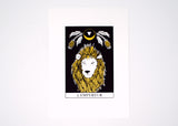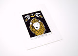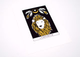 This gorgeous two color screen print is Joelle's interpretation of The Emperor card from the Major Arcana of the tarot deck. Equal parts playful and symbolic it’s the perfect piece of decor for those who love to consult the cards. Printed in a deliciously shimmery gold metallic ink that delights up close. A great size for adorning a small space or grouping together for a gallery wall look.