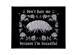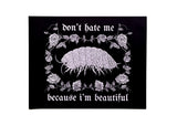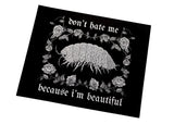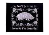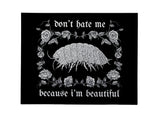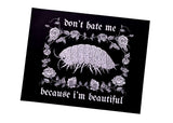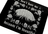 The original illustration is titled "The Isopod", and features a delicately texture illustration of an isopod with rose floral framing and the words "don't hate me because i'm beautiful" in a blackletter script.