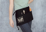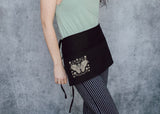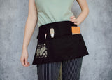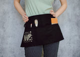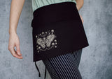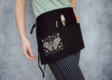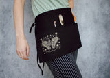 This dreamy black half apron featuring our detailed illustration of an atlas moth with delicate mushroom and star framing is equal parts functional and delightful. Use it to hold change at a craft fair or to keep a pad for taking orders at a cafe; or perhaps you want to have your brushes close at hand; whatever your needs it’s three handy pockets are a perfect fit. Speaking of perfect fit, the adjustable tie back closure ensures just that!