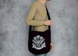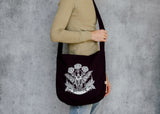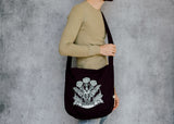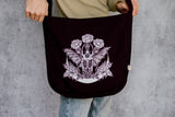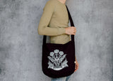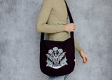 This stunner black cotton slouch bag is a functional and multi purpose art object featuring our intricate and dreamily detailed goliathus beetle, floral, and crescent moon design. The organic canvas is flexible but sturdy with a wide comfortable strap that’s easier on the shoulders than your standard tote bag. Perfect as an everyday errand crossbody or as a roomy but manageable project bag for the crafter on the go.