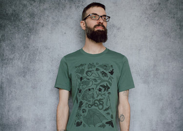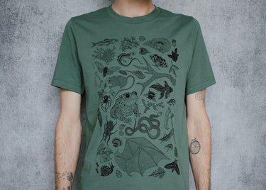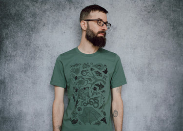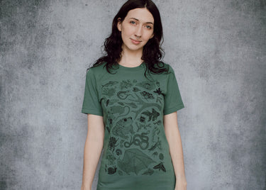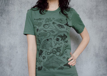 This gorgeous spruce green tee truly has it all! Bugs! Skulls! Snakes! Mushrooms! Woodland Creatures! All sorts of sweet little bits of outdoorsy goodness in breathtaking detail sure to stir the collector and the outdoor lover’s heart alike.