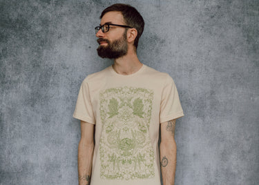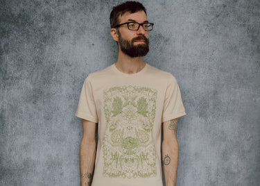 This perfectly soft beige tee is a tip of the hat to growers and market goers! The detail is truly over the top: cherry tomatoes, trailing peas, bunches of broccoli, hot peppers and leafy radishes, delectable chanterelles. It's enough to make your mouth water!