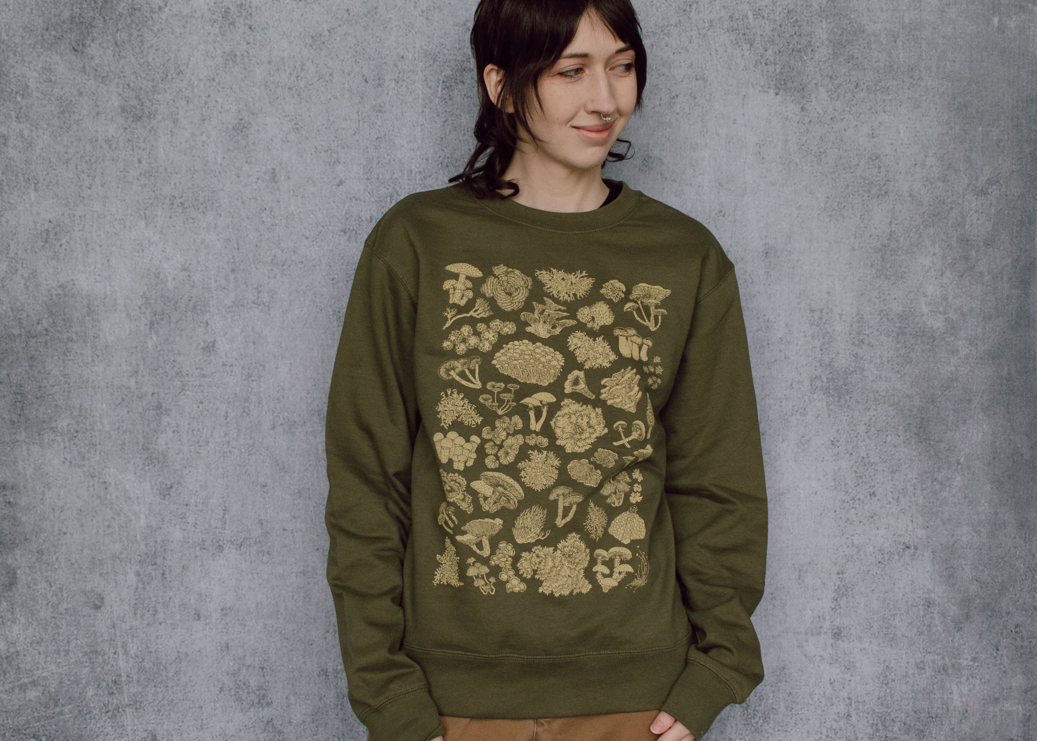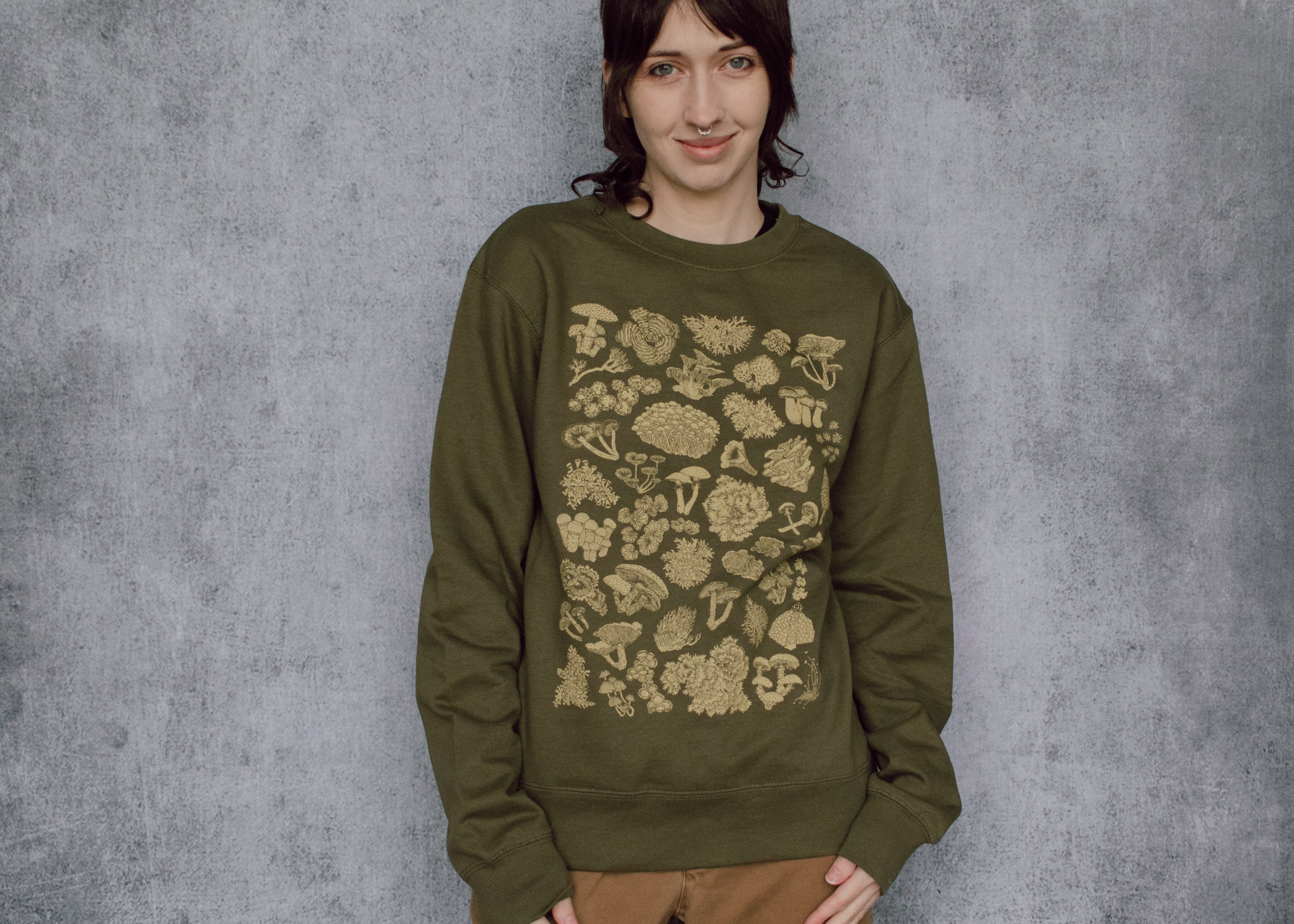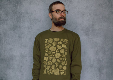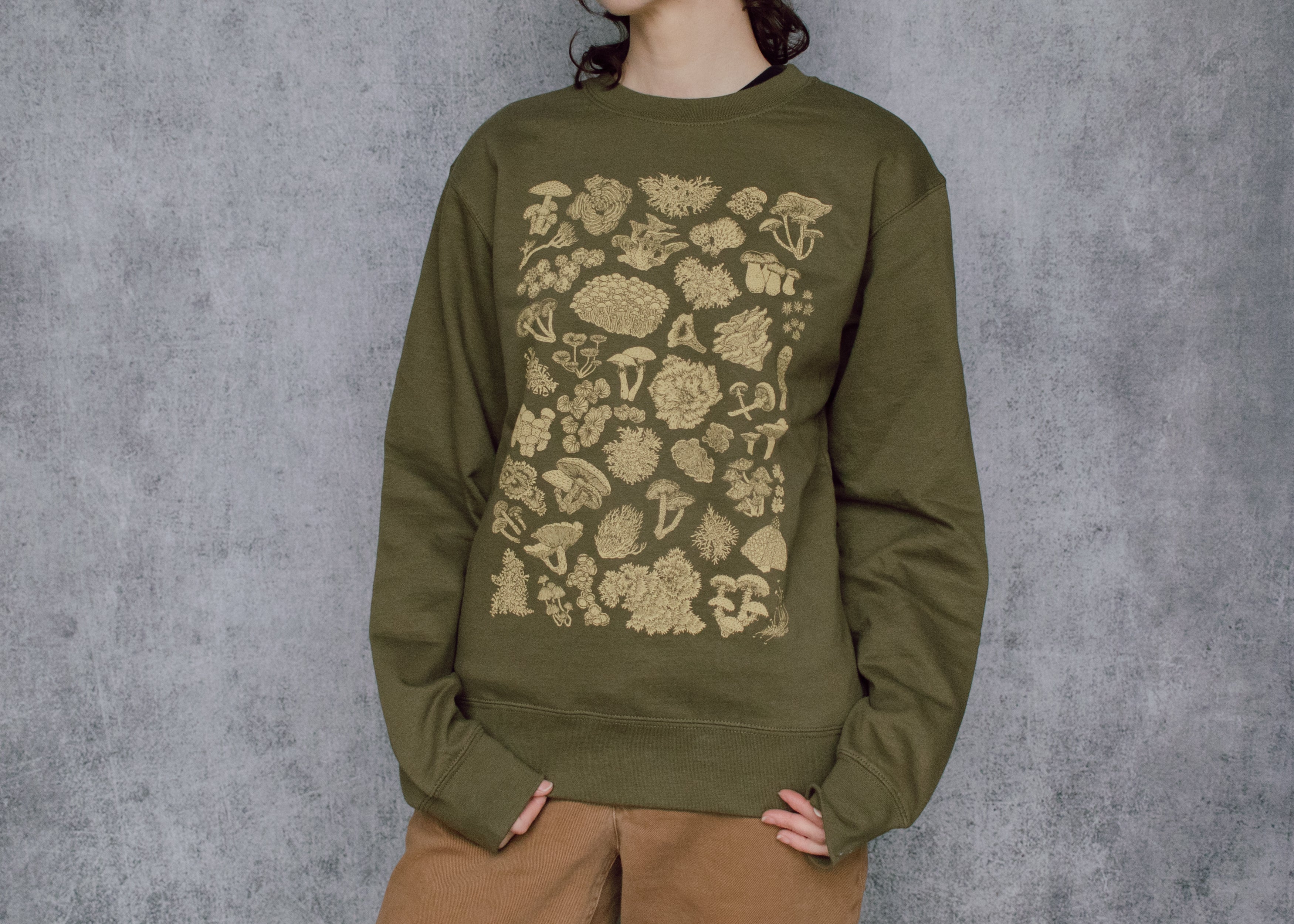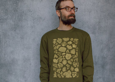 This earthy green crewneck features a high detail hand illustrated collection of mushrooms, lichen and moss. The perfect cozy wear for toadstool fans, forest friends, and nature lovers alike!