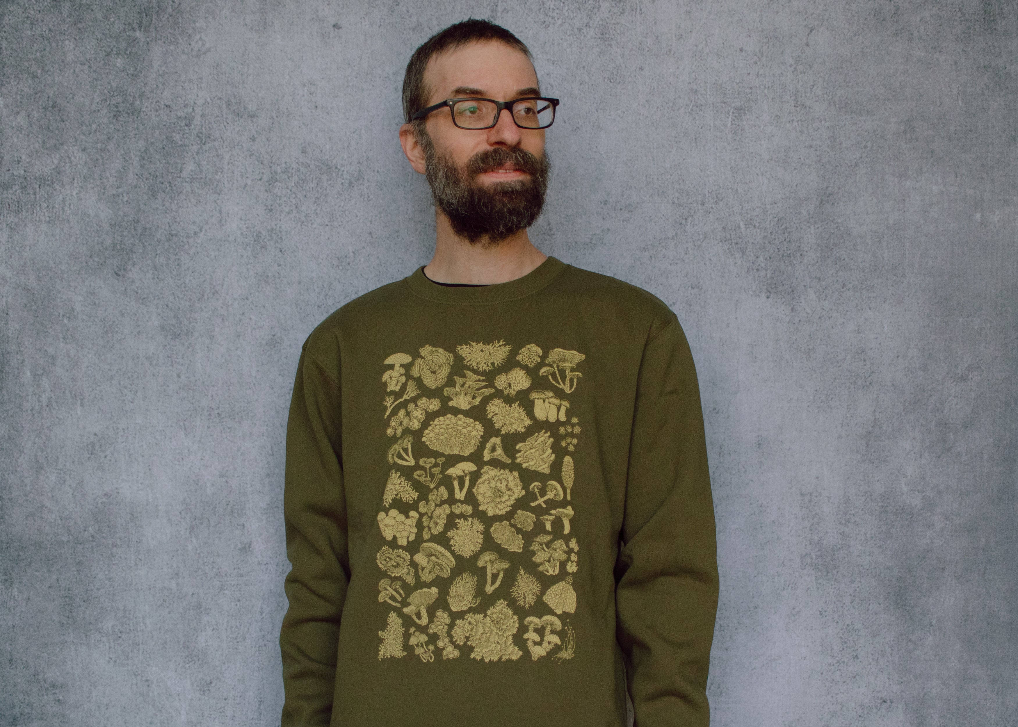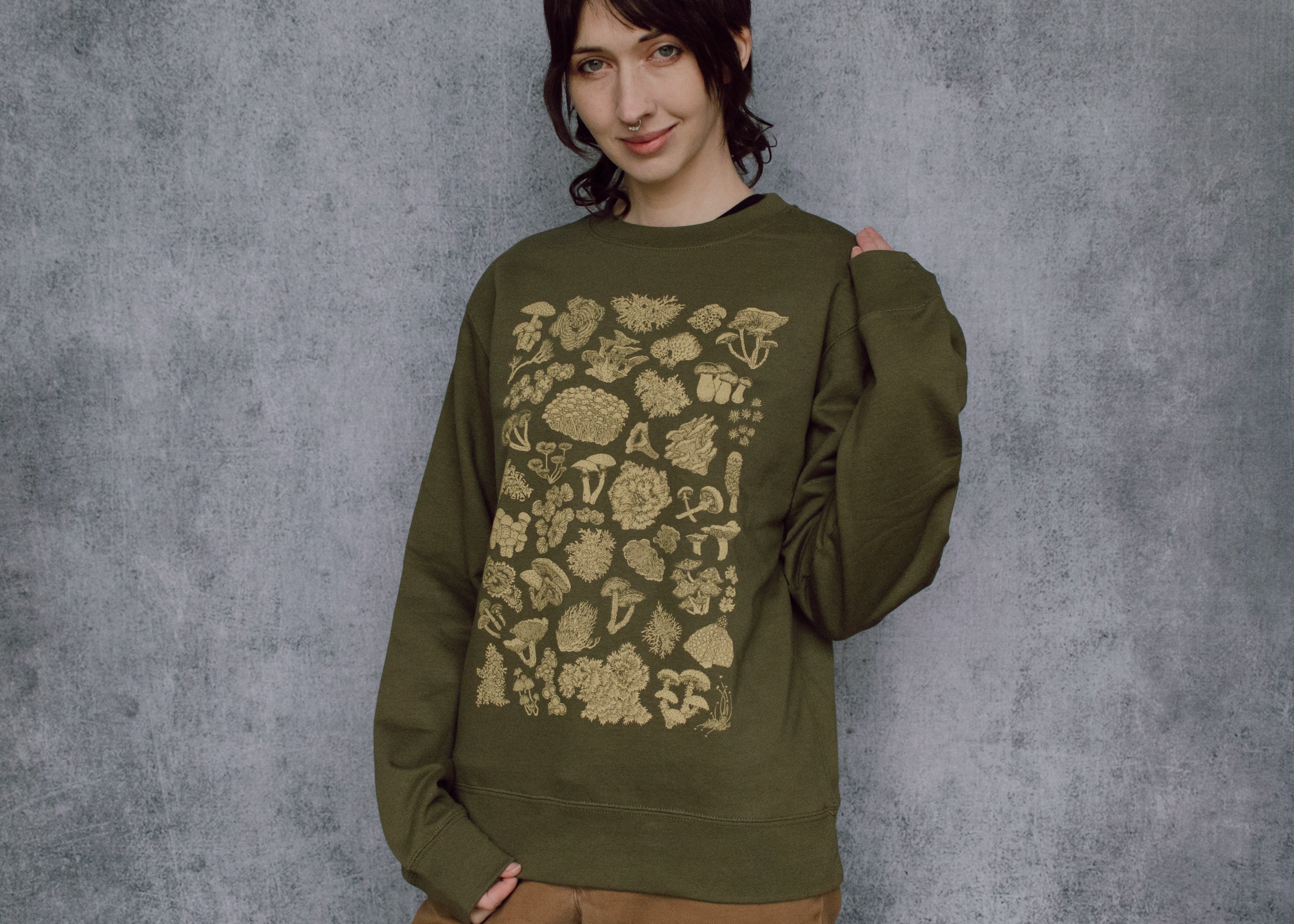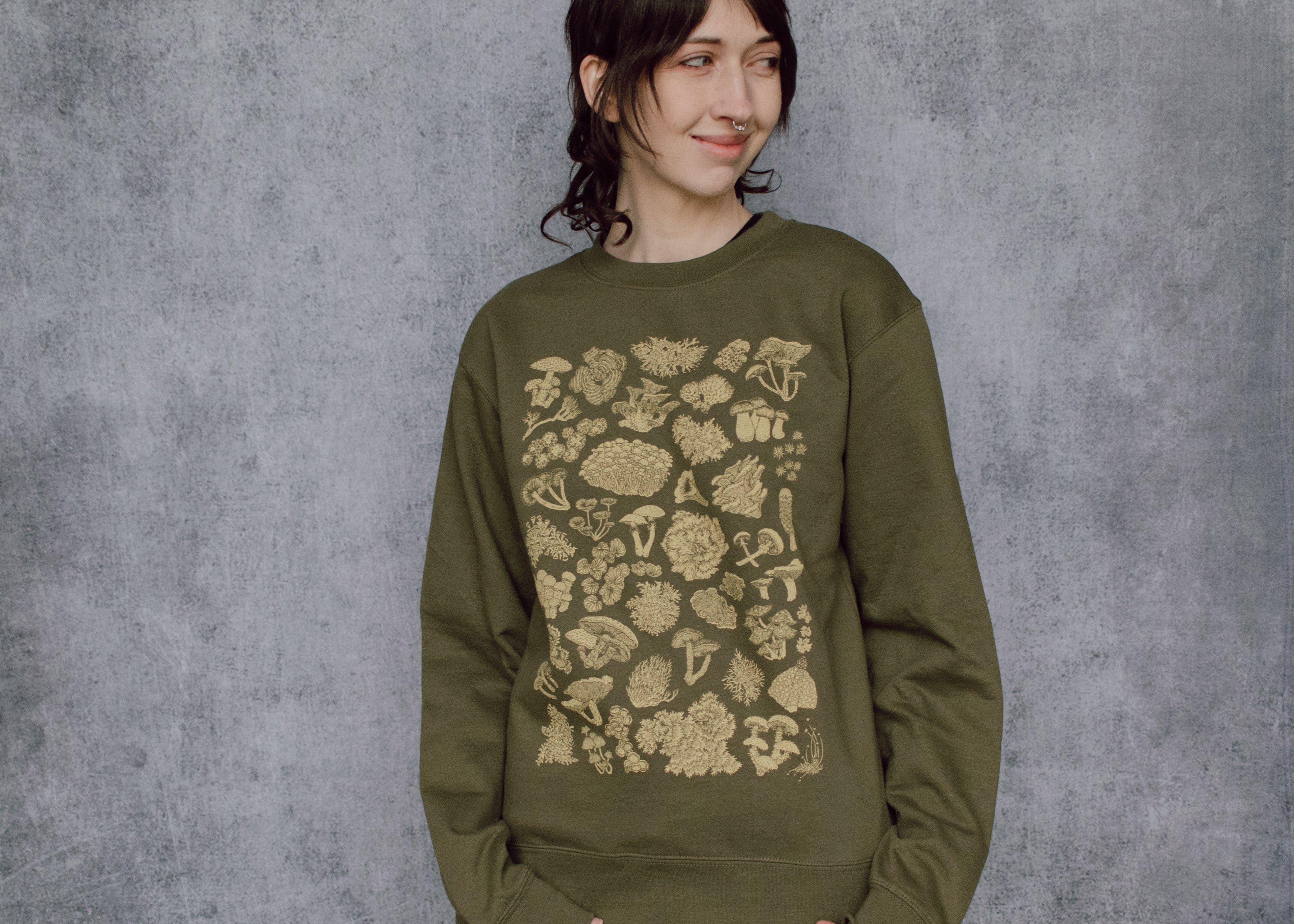 This earthy green crewneck features a high detail hand illustrated collection of mushrooms, lichen and moss. The perfect cozy wear for toadstool fans, forest friends, and nature lovers alike!