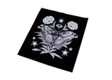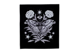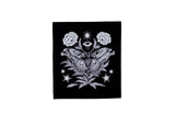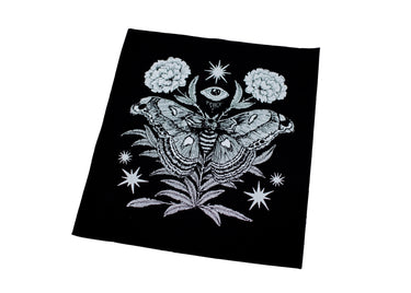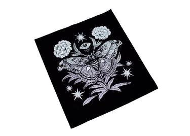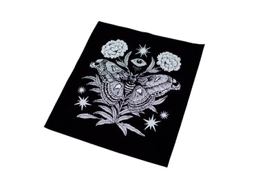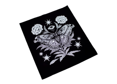 This detailed black colored sew-on back patch features our original illustration of an atlas moth with florals, stars, and an eye. A great size for the back of your favorite jacket or vest, made from durable fabric that’s sure to stand the test of time!