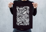 This open edition poster is a single color screen print on 100 lb black paper using water based non-toxic white ink. It is 12 by 16 inches with black open margins for matted framing etc. The centered artwork within is approximately 8 by 12 inches.