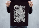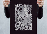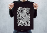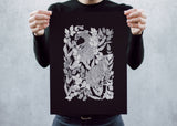 This open edition poster is a single color screen print on 100 lb black paper using water based non-toxic white ink. It is 12 by 16 inches with black open margins for matted framing etc. The centered artwork within is approximately 8 by 12 inches.