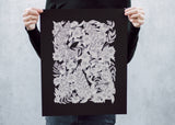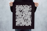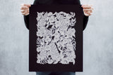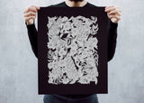 This open edition poster is a single color screen print on 100 lb black paper using water based non-toxic white ink. It is 16 by 20 inches with black open margins for matted framing etc. The centered artwork within is approximately 12 by 16 inches.