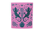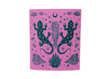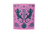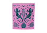 Swedish dishcloths may be my all time favorite eco friendly product because they actually improve upon the disposable items they seek to replace. As soon as I tried one in my kitchen for the first time, I knew we had to make our own with a touch of hand printed Fennec flair; like this pink colored cutie featuring salamanders with alchemical elements.