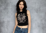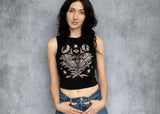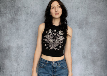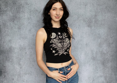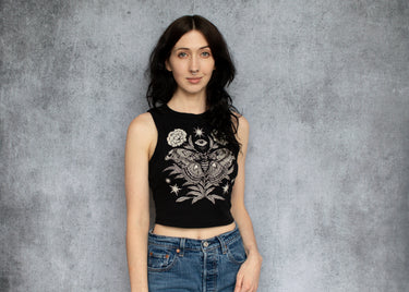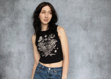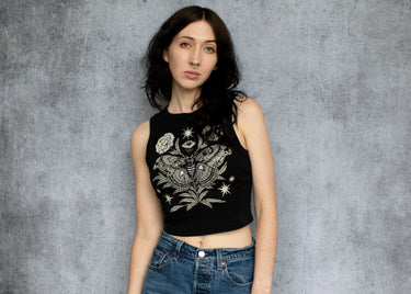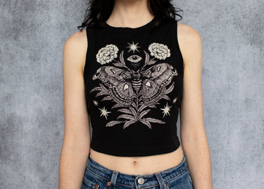 This comfy ribbed crop tank finds us pairing the natural beauty of the atlas moth with a detailed eye (a mythological titan of protection) and dreamy florals. It’s a classic feeling design that evokes a certain timelessness, equal parts winsome and dark.