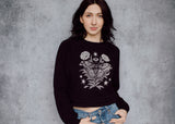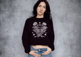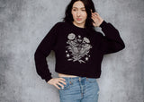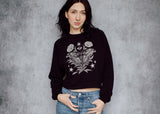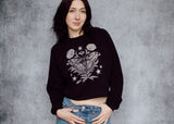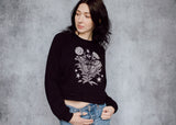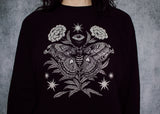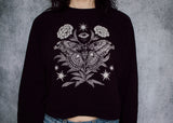 This cozy cropped sweater finds us pairing the natural beauty of the atlas moth with a detailed eye (a mythological titan of protection) and dreamy florals. It’s a classic feeling design that evokes a certain timelessness, equal parts winsome and dark.