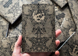 - 3.5 inch by 5 inch, with gold staples at the binding