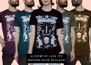 - two unisex t-shirt "Alchemy of Luck" and "The Decomposer," with option to select your size and either random color or all black tees.