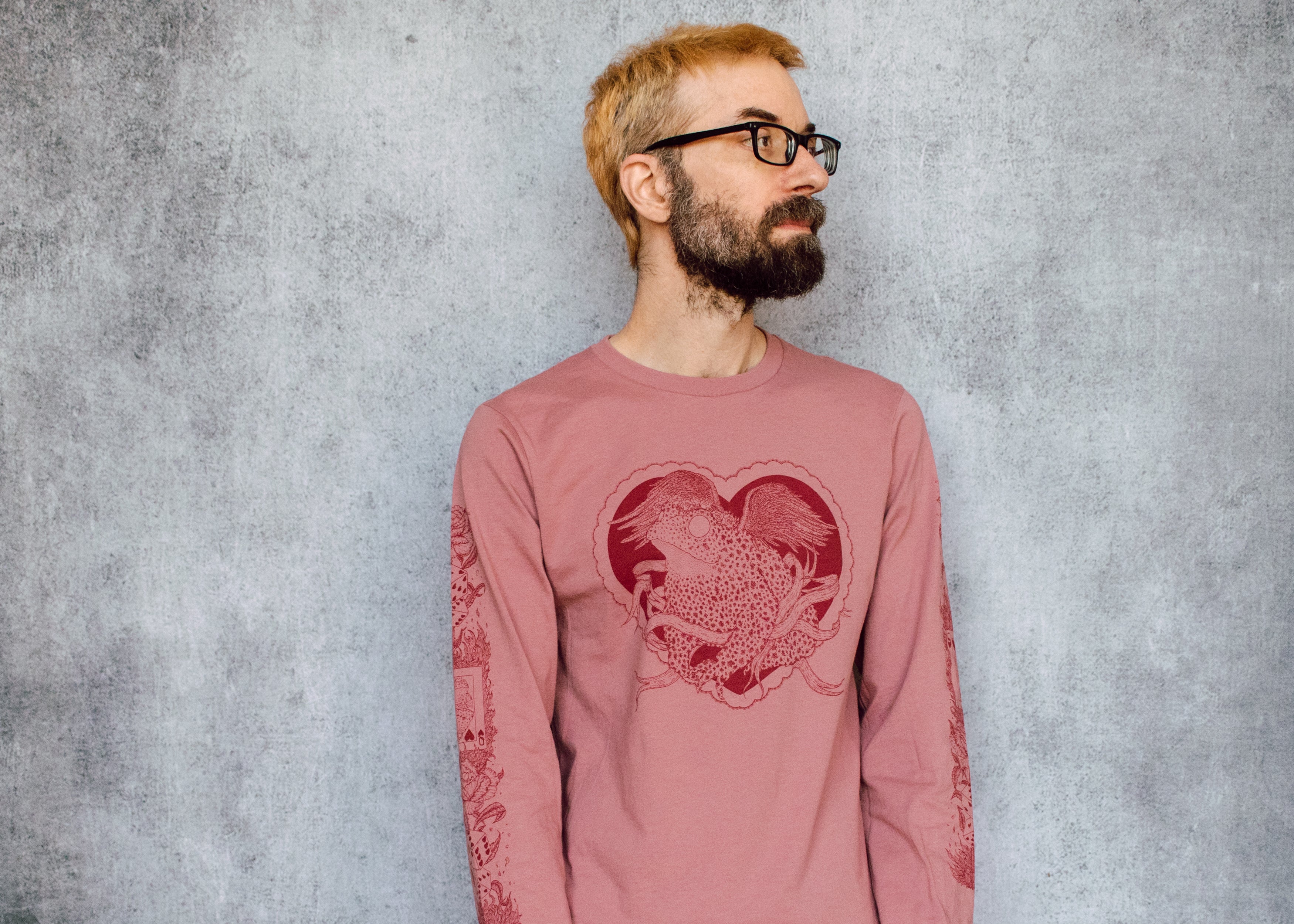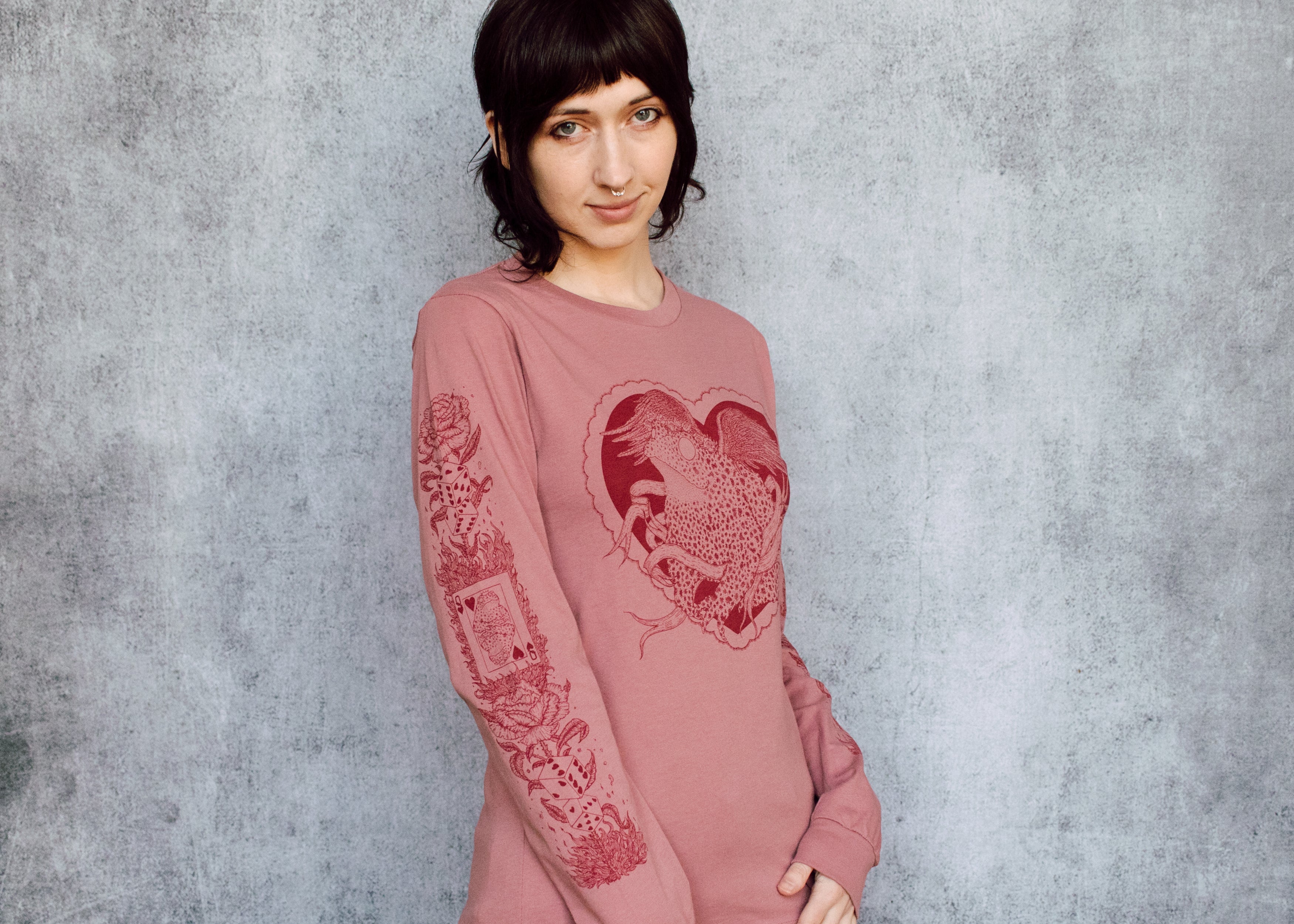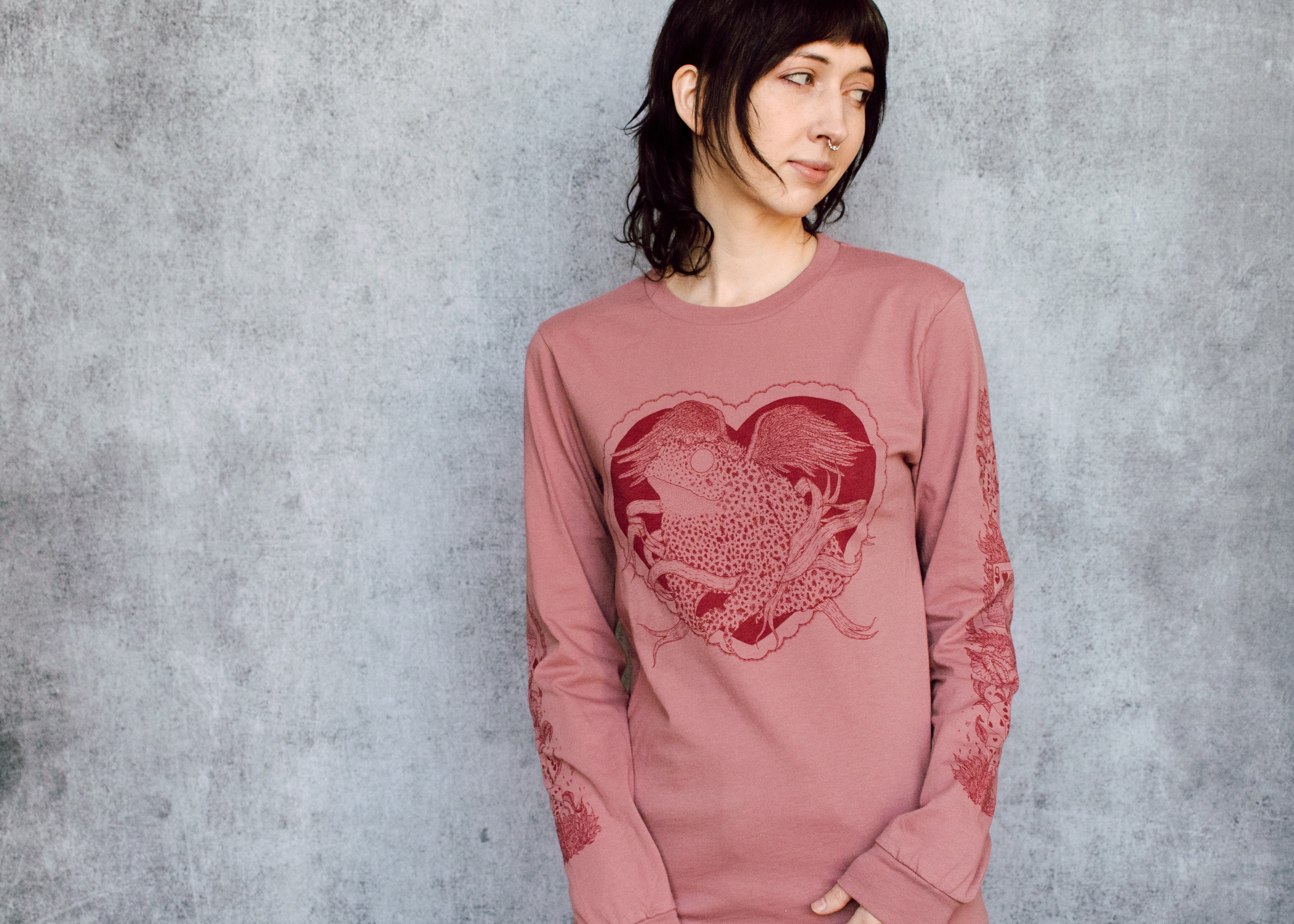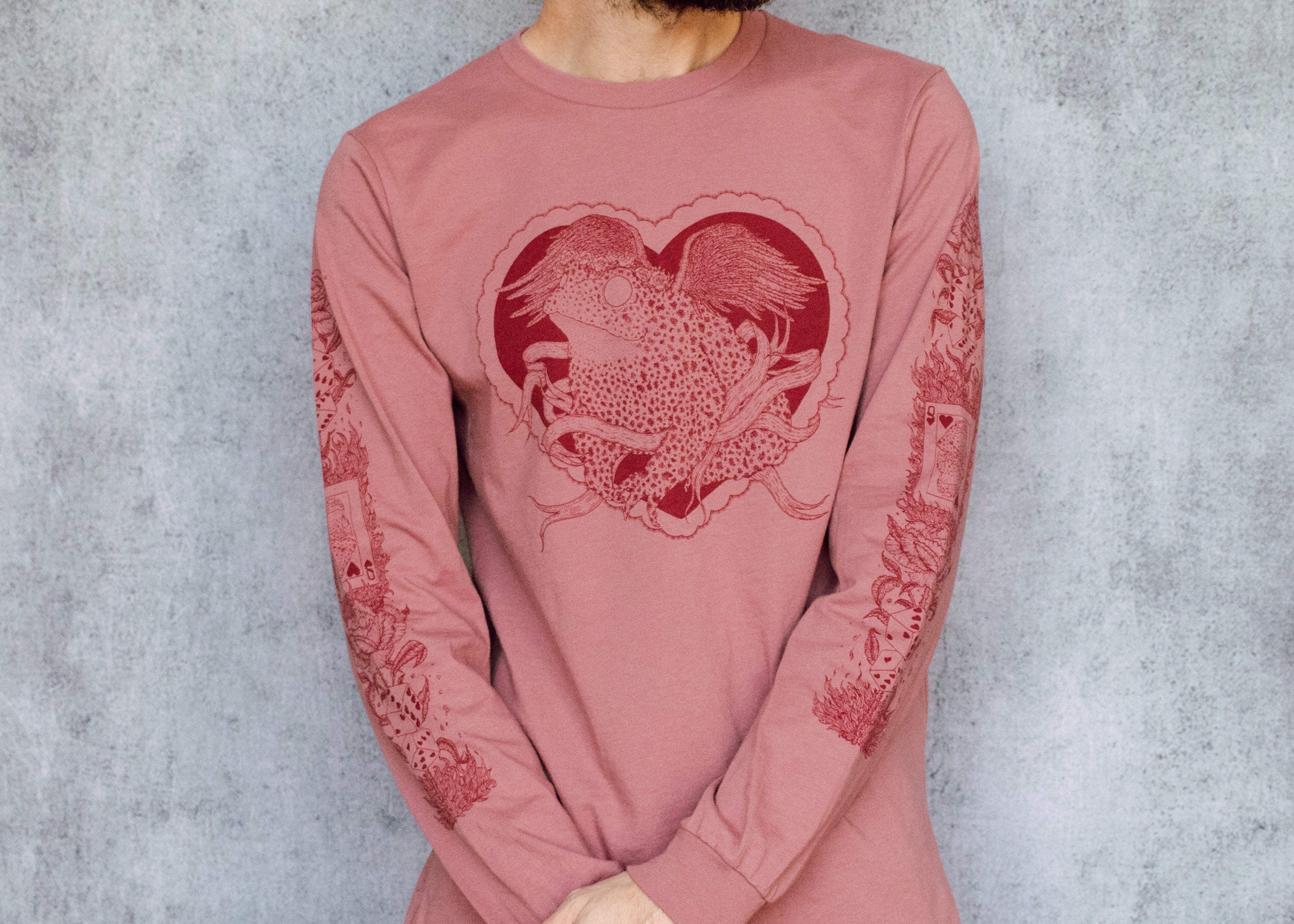 Here at Fennec we’re suckers for the kitsch and gooey fun of Valentine’s Day! And what better way to celebrate the season of romance than with a sweet lumpy CUPID TOAD on a rosy mauve long sleeve. Plus, check out that playfully detailed screen print featuring a "Queen of Toads" playing card, surrounded by roses, flames, and heart dice. What’s not to love?